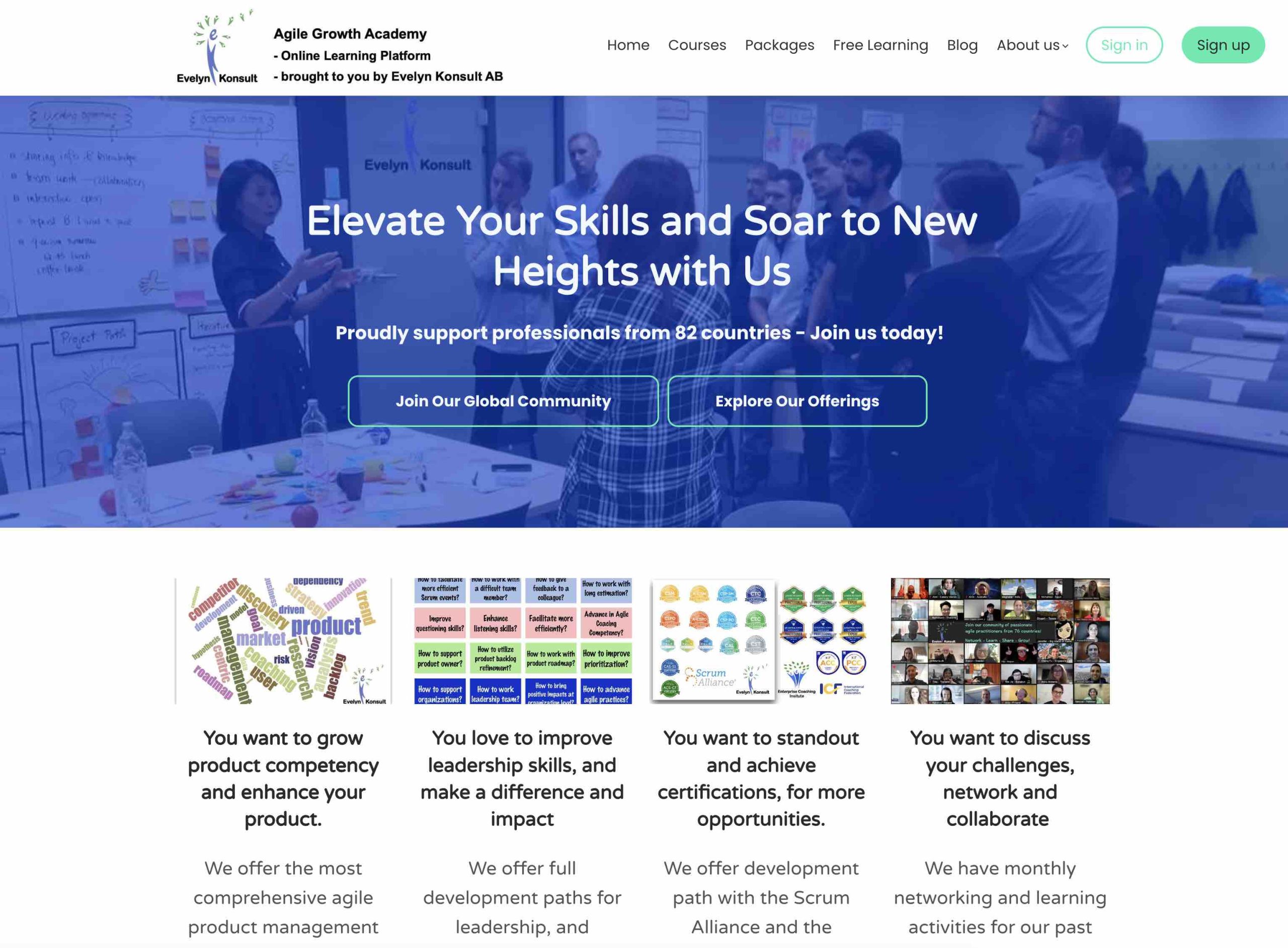Evelyn Konsult AB是Evelyn Tian老师与2017年在瑞典创建。目前为全球来自80多个国家的敏捷爱好者提供教练,辅导,培训及咨询工作。